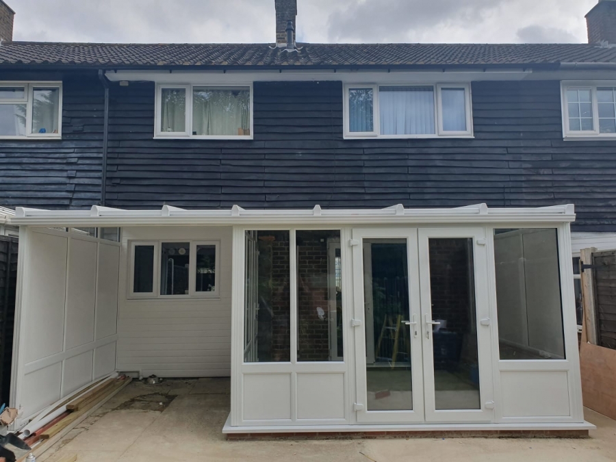 Warm roof conservatory with flush PVC resurgence frames and internal blinds